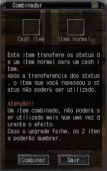 Além desses ítens, existem os combinadores. Seu uso é sempre combinado a um customizador, que pode ser tanto para arma quanto para o set. Da mesma forma que a pedra brilhante, seu bônus entre +1, +2 e +3, e seu tempo de duração é de 1 mês. Se for seu desejo que o bônus acabe antes do prazo de 1 mês, então um descombinador deve ser usado. Lembramos que ambos os ítens estão disponíveis apenas na loja de cash.Sabemos que equipamentos acima do level 73 só podem ser usados por personagens com o level do ítem ou acima. Porém com os combinadores, isso não é verdade! Um ítem combinado pode ser usado por chars com até 4 levels menor.
